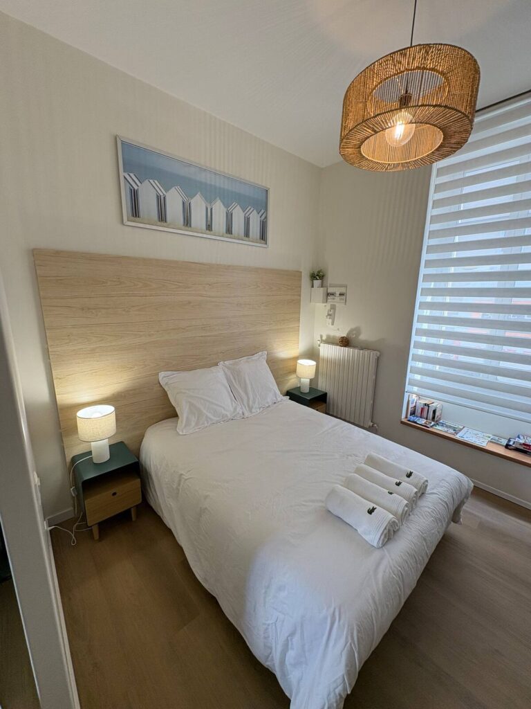 Coin lit : Lit confortable, tables de chevet, lampes de lecture, armoire/penderie, commode